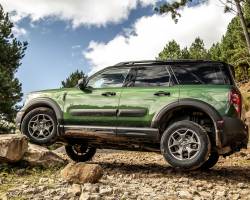 Carroceria – A vocação off-road está presente em todos os aspectos do Bronco Sport. A rodagem em terrenos irregulares é facilitada pela altura do solo de 22 cm, ângulo de entrada de 30°, ângulo de saída de 26,7º e ângulo de transposição em rampa de 20º, junto com os pneus todo-terreno 225/65 R17 Pirelli Scorpion. Ele tem também para-choque com protetor de aço, alargadores de para-lama e capacidade de imersão de 600 mm.