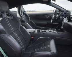 No cockpit, o Dark Horse SC exibe o volante de base chata revestido em couro do Mustang GTD, com controles de performance e detalhes em Alcantara e fibra de carbono. Bancos esportivos opcionais Recaro em couro e Dinamica – material ecológico premium – estão inclusos no Track Pack, com detalhes em cinza ou azul-esverdeado (Teal) e uma tampa no lugar dos bancos traseiros.