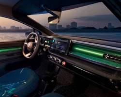 Os bancos trazem padrões coloridos inspirados no original, com acabamento similar aplicado ao revestimento das portas e ao painel de instrumentos. Entre os destaques, o carro possui painel de instrumentos digital e uma tela multimídia central. Abaixo dela, há três grandes botões giratórios para o controle da ventilação e ar-condicionado.