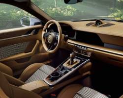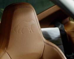 A pelugem marrom do animal inspirou o departamento de design da divisão Sonderwunsch para escolher o com ‘Corriba Brown’ para o couro do interior. Os bancos esportivos combinam ainda a parte central em tecido branco, marrom e preto, utilizando o padrão de estamparia dos Porsches clássicos.