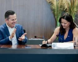 Governador Mauro Mendes sancionou projeto que cria premiação, e a secretária de Comunicação, Laice Souza, divulgou as regras em cerimônia no Palácio Paiaguás