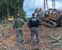 Equipes do Batalhão de Polícia Militar de Proteção Ambiental do 8º Comando Regional apreenderam dois tratores, uma escavadeira hidráulica e diversas toras de madeiras extraídas de maneira irregular, em uma propriedade rural localizada no município de Colniza (1.048 km de Cuiabá).