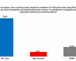 O estudo também aponta que 73% da população entrevistada aprova a iniciativa do TCE-MT de promover mesa técnica para discutir o superendividamento de servidores públicos estaduais com empréstimos consignados e auditoria para esclarecer cobranças de juros, prestações e correções aplicadas por instituições financeiras.