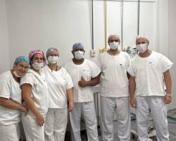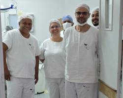 A imagem mostra toda a equipe presente no mutirão: otorrinolaringologista, anestesista e equipe de enfermagem